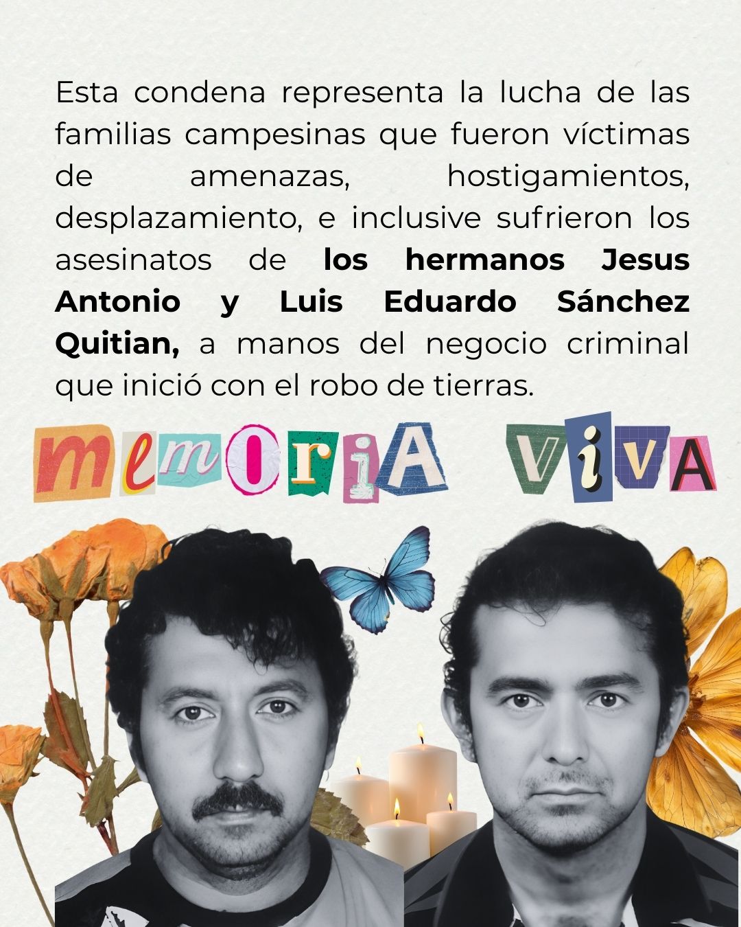 Esta condena representa la lucha de las familias campesinas que fueron víctimas de amenazas, hostigamientos, desplazamiento, e inclusive sufrieron los asesinatos de los hermanos Jesus Antonio y Luis Eduardo Sánchez Quitian, a manos del negocio criminal que inició con el robo de tierras. Particularmente, destacamos la memoria de MIGUEL ÁNGEL SÁNCHEZ ARIZA y MIGUEL ANSELMO SÁNCHEZ QUITIÁN, padre e hijo que incansablemente denunciaron y resistieron hasta el final de sus días en contra de la impunidad y en aras de lograr justicia.